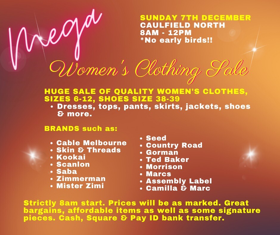 Huge sale of quality women's clothes, Sizes 6-12, shoes size 38-39 Dresses, tops, pants, skirts, jackets, shoes & more. BRANDS such as: Cable Melbourne Skin & Threads Kookai Scanlon Saba Zimmerman Mister Zimi Seed Country Road Gorman Ted Baker Morrison Marcs Assembly Label Camilla & Marc Strictly 8am start - please do not arrive early. Amazing bargains, affordable items as well as some signature pieces. Cash or Pay ID bank transfer.
