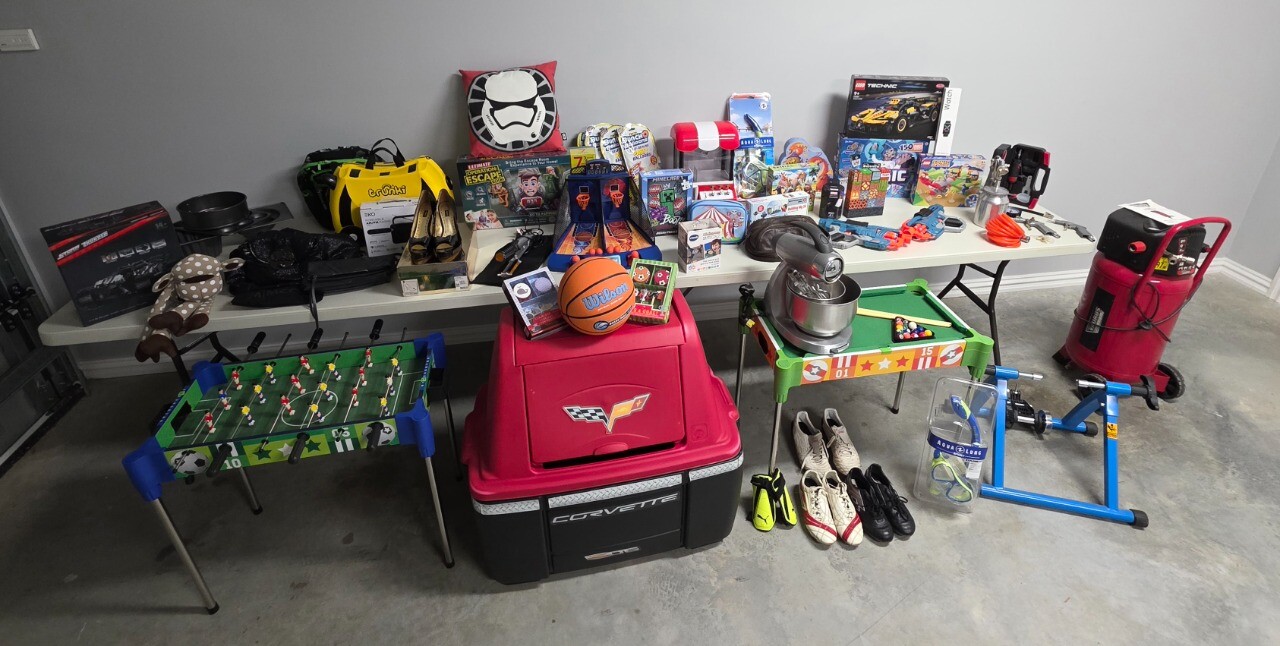 Toys, furniture, tools, homewares, glassware, sporting equipment, shoes, gandbags, Clothing, Cake decorating, bakeware, rugs, music keyboard, lego, pool and beach items