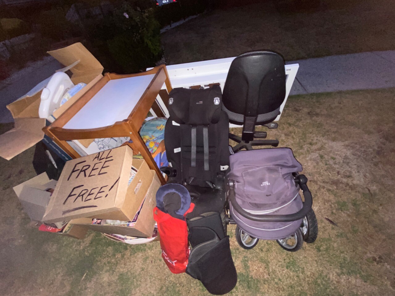 *Everything listed on this notice is FREE and on our nature-strip now, only until end of Sunday 15/2/26. … The only items available for this address/date are on our nature-strip & are FREE!! Help yourself. … *Boori-style Baby Cot (white)-(excellent cond.). *Swallow Baby High chair (white)(v.good cond.)(in box). *Boori-style Baby Changetable-(excellent cond.). *Velco Baby Pram with rain cover-(tyres need pumping)-(grey)(v.good cond.). *Britax Car Seat-(Newborn-8yrs)-(excellent cond.)(purchased new in Feb 2020.). *100s quality new magazines/new cookbooks. *4-way gas-lift desk chair-(excellent working perfectly cond.). *Boxed NEW unused clothes iron. *Boxed NEW unused white elec kettle. *Green Suitcase-(used cond.). ***Hoping to add more FREE items onto nature-strip today*** .. DIY pick up. Today only. .. Unfortunately.Sorry no replies to any queries.