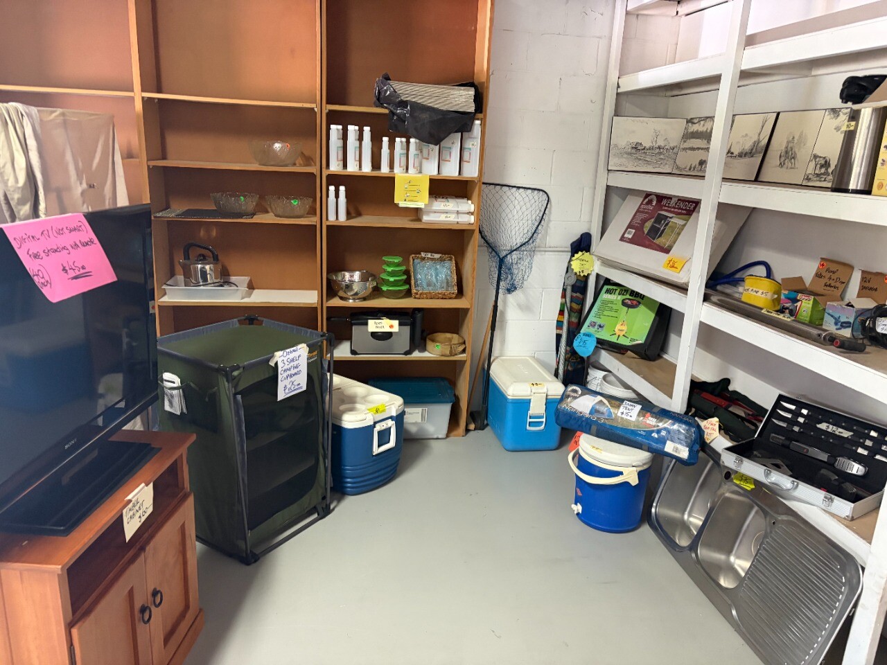 Lots of items to clear from house move. Some camping gear, bbq tools, eskies, framed pictures, glass ware, cake stands, bowls, double kitchen sink, old block splitter and hammers. VHS cassettes, CD's. Lots more.....