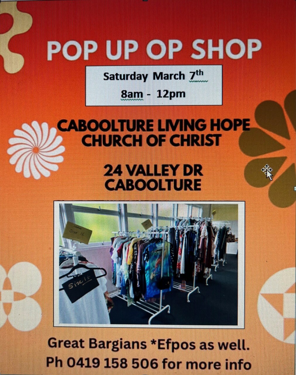 The Caboolture Living Hope Church is having a Pop Up Op Shop on Saturday March 7th at 8am - 12pm at 24 Valley Drive, Caboolture. Lots of Bric a Brac, Toys and Clothes at bargain prices.