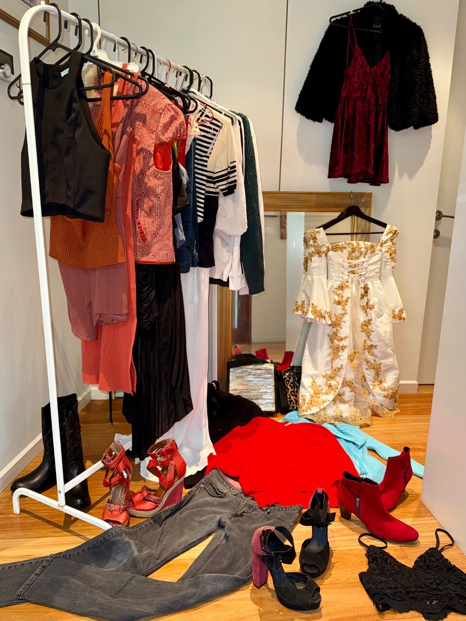12 HOUSES MASSIVE CLAUSCEN STREET GARAGE SALE Clothes young adult S-XS Adult and kids clothes Ski clothes and gloves Technical clothes Bags & shoes Mirror Jewellery Furniture and rug Girls sheets and cute stuff Netball ring freestanding Couch worn funky design for a shared house porch