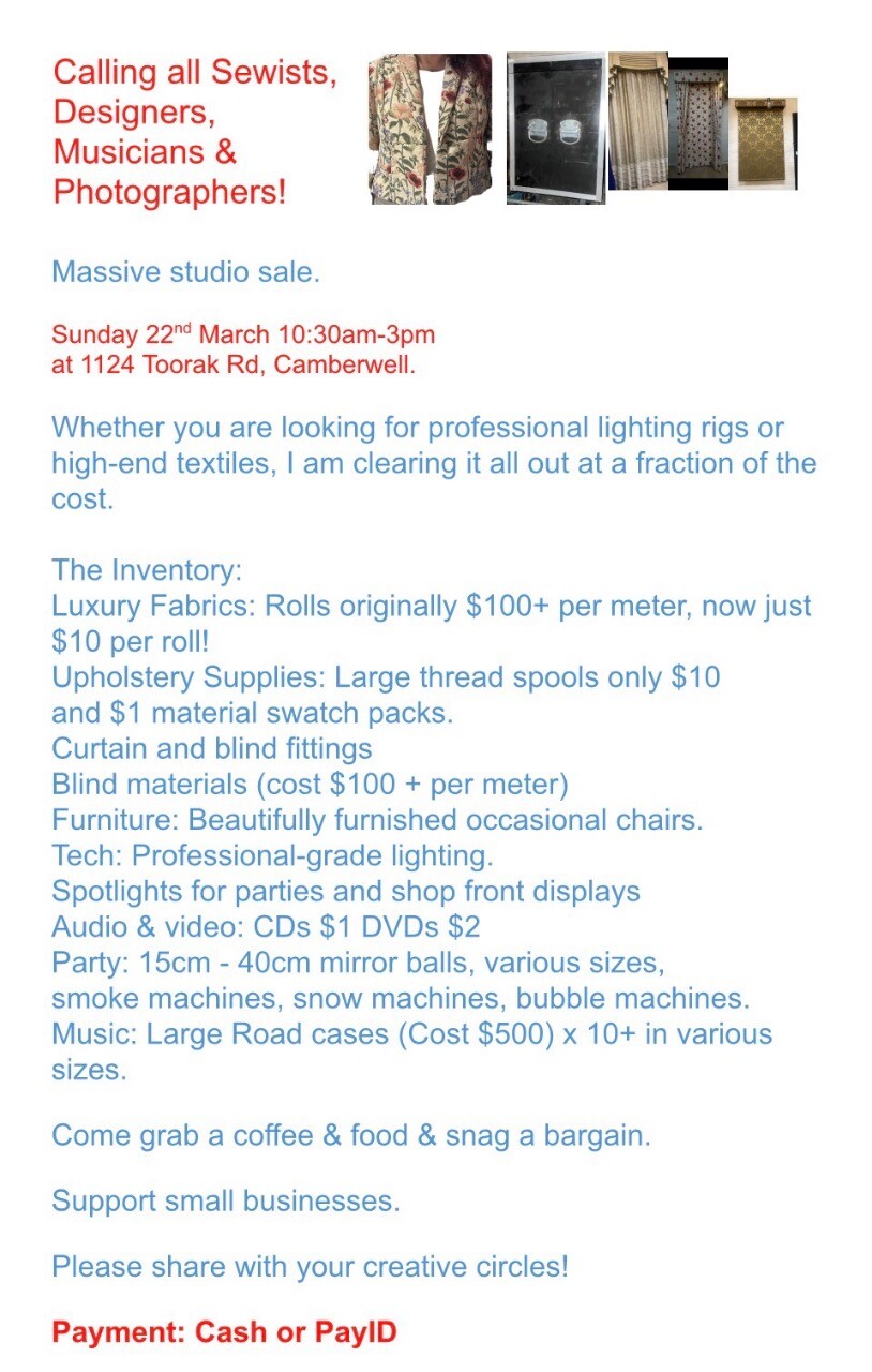 Whether you are looking for professional lighting rigs or high-end textiles, I am clearing it all out at a fraction of the cost. The Inventory: Luxury Fabrics: Rolls originally $100+ per meter, now just $10 per roll! Upholstery Supplies: Large thread spools only $10 and $1 material swatch packs. Curtain and blind fittings Blind materials (cost $100 + per meter) Furniture: Beautifully furnished occasional chairs. Tech: Professional-grade lighting. Spotlights for parties and shop front displays Audio & video: CDs $1 DVDs $2 Party: 15cm - 40cm mirror balls, various sizes, smoke machines, snow machines, bubble machines. Music: Large Road cases (Cost $500) x 10+ in various sizes. Come grab a coffee & food & snag a bargain. Designer clothing - small sizes