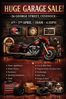 Everything must go Cessnock's huge garage sale make sure you bring your trailers and utes because all sorts of stuff expensive and cheap from Harley parts to kids toys there's evan cars if u want the whole house is going so come see what u need because I bet I have it.