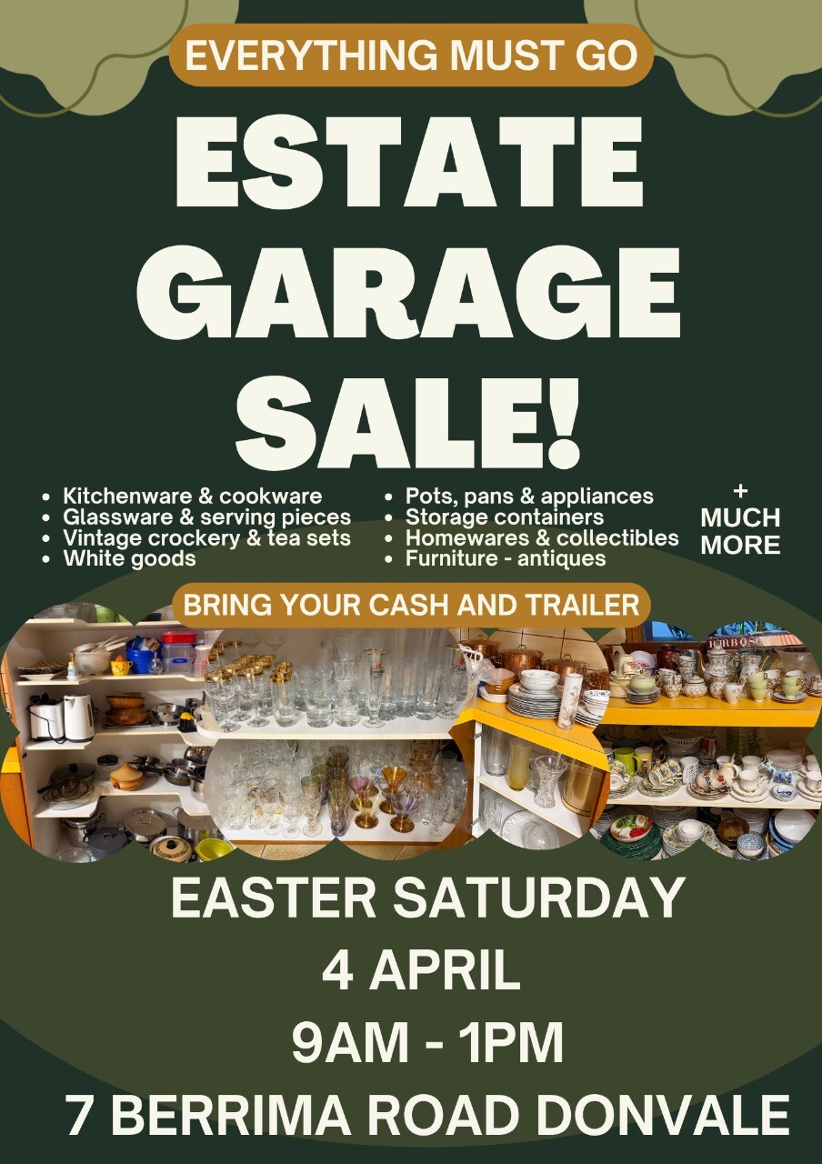 π¨ ONE DAY ONLY β MASSIVE ESTATE SALE π¨ Everything must go! A huge range of items available: β’ Kitchenware & cookware β’ Glassware & serving pieces β’ Vintage crockery & tea sets β’ Pots, pans & appliances β’ Storage containers β’ Homewares & collectibles β’ Furniture & antiques + MUCH MORE! π₯ Bargains everywhere β priced to clear π₯ Perfect for resellers, collectors & families π₯ Bulk deals welcome π 7 Berrima Road, Donvale π Easter Saturday, April 4 β° 9AM β 1PM π΅ CASH ONLY π Bring a trailer β large items available π Be early for the best finds β everything must go!