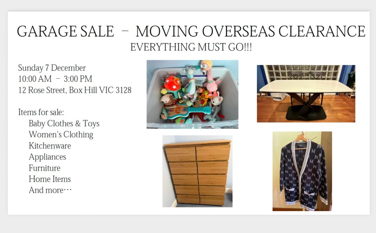 🔥 GARAGE SALE – MOVING OVERSEAS CLEARANCE 🔥 Everything Must Go! One Day Only 📅 Sunday, 7 December ⏰ 10:00 AM – 3:00 PM 📍 12 Rose Street, Box Hill VIC 3128 We are moving overseas and clearing the entire house — everything must go! Great condition items, bargain prices, first come first served. 🛒 Items for Sale: • Baby clothes & toys • Women’s clothing • Kitchenware & homeware • Small appliances • Furniture • Home items & storage • And much more! 💡 Why come? • Everything priced to clear • Lots of variety — good for families, students, new renters • Easy access, onsite pickup 📸 Plenty of photos available — message me if you want to see more. 🚗 Parking available nearby. ⏰ Come early for the best deals!