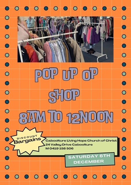 The Living Hope Church is having their Pop Up Op Shop on Saturday December 6th at 8am - 12pm at 24 Valley Drive Caboolture. Low prices on clothing and bric a brac.