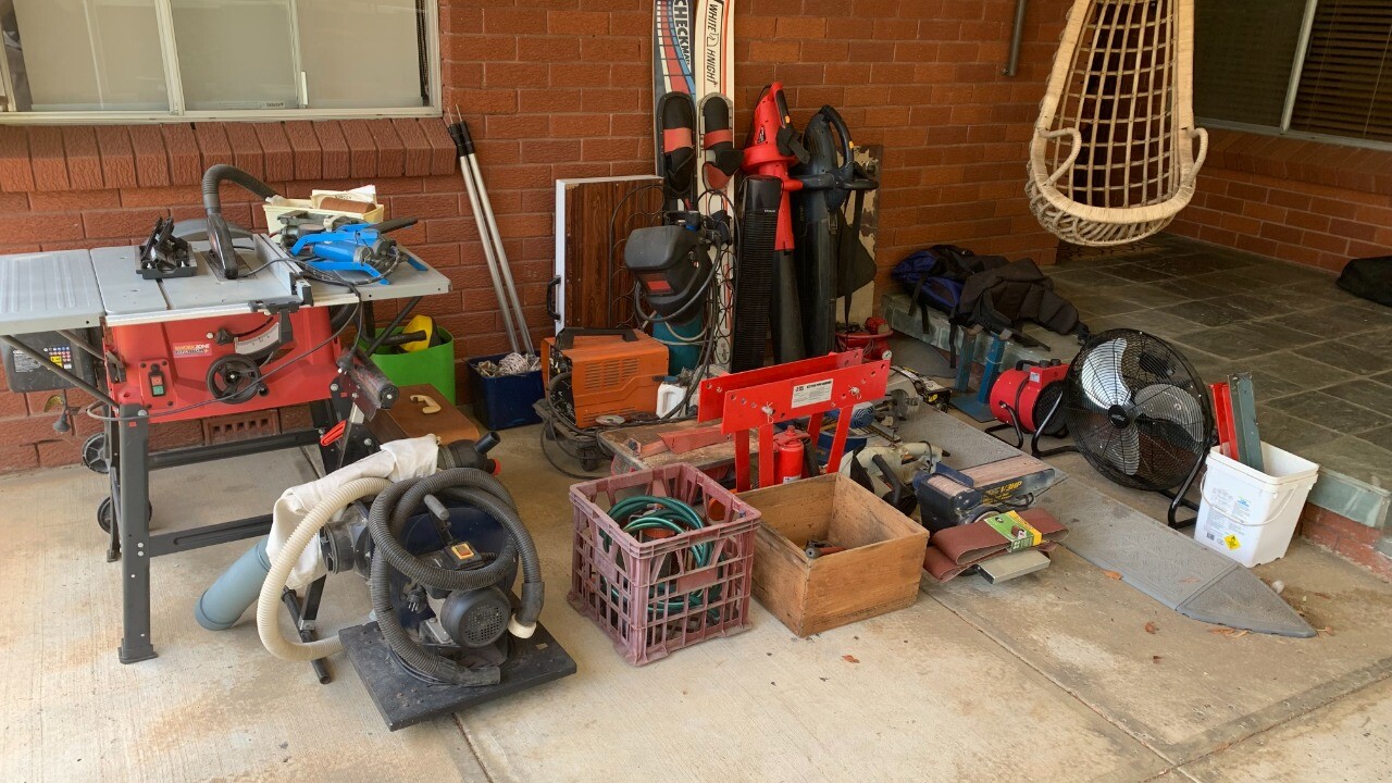 mainly shed tools, bench saw, Mig welder, radial arm saw etc. (see picture) some camping eqp't, water skis, sewing machine.