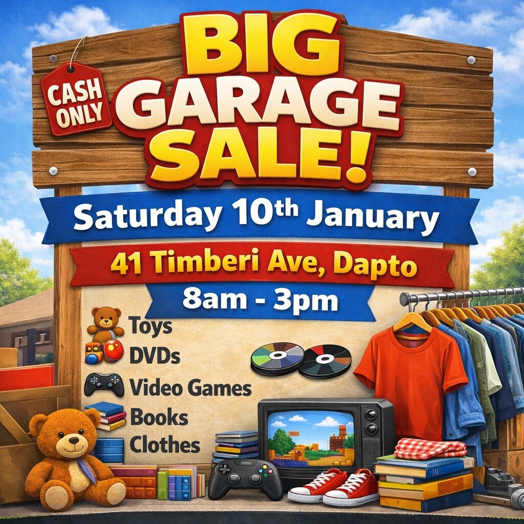 BIG GARAGE SALE โ Saturday 10th January Weโre having a big garage sale and have heaps of stuff to go! ๐งธ Toys ๐ Clothes (kids & adults) ๐ DVDs ๐ฎ Video games ๐ Books ๐งฉ Bric-a-brac & random treasures Something for everyone and cheap prices โ perfect for resellers, families, or anyone who loves a bargain. Cash only ๐ No early birds please Come have a look โ everything must go!