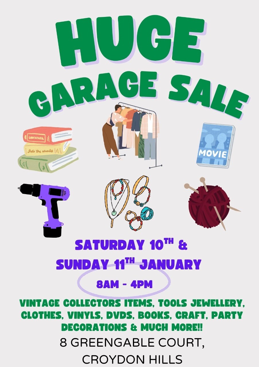 Garage Sale Saturday 10th and Sunday 11th January . * Vintage Collectors Items, Tools and hardware, Ladies Clothes, Baby and Kids Clothes, jewelry, Books, DVDs, Vintage Records, Toys, Craft and scrapboking stuff, Homeware & Heaps More