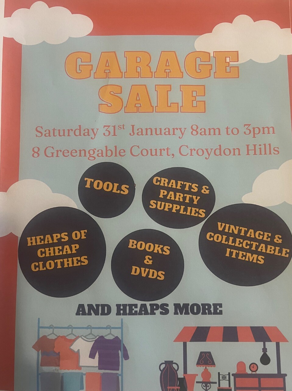 Garage sale - heaps of stuff for sale . tools, ladies clothing , kids clothing , jewellery, toys, vintage and collectors items, electronics, books, vinyl, DVDs, party decorations, crafts, camping stuff and heaps more