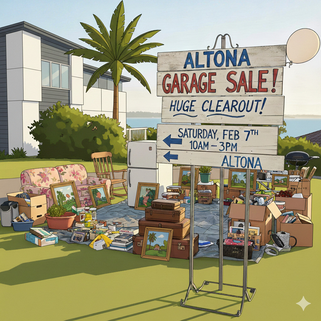 Garage sale on this Saturday in Altona. Selling furniture (dining set, sofas, beds, tables, drawer chests), appliances (fridge, washing machine, dryer, Nespresso machine, kettle, toaster), paintings, jewellery, clothes, art, bric-a-brac and much more. Address will be provided on Friday evening.