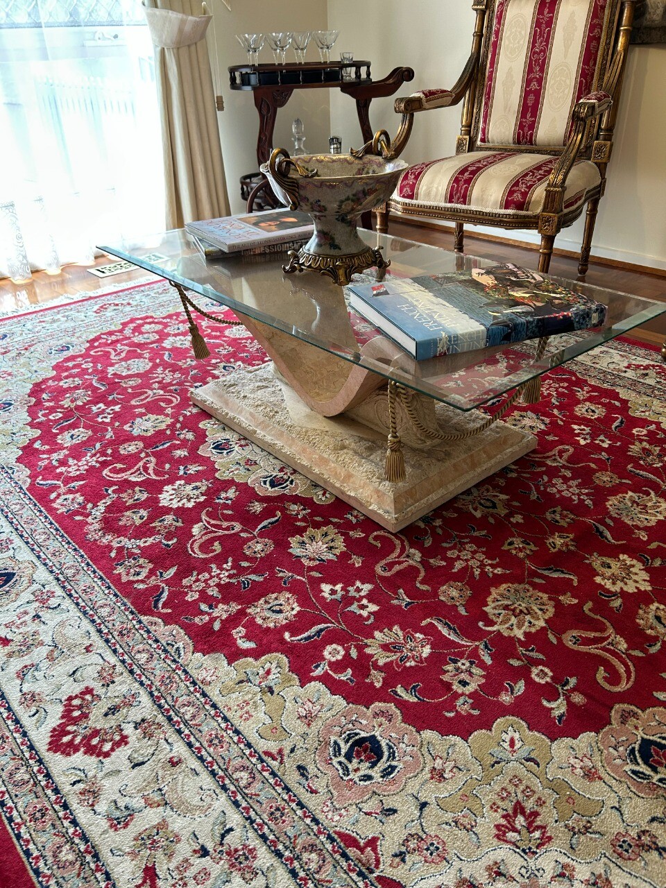 1. Coffee table with an exquisite mix of glass (top), marble and wrought iron, Louis XVI neoclassical style. Price: $150