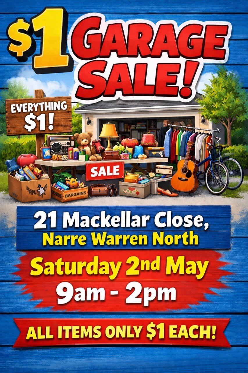 Everything $1 garage sale Saturday, 2nd of May One day only! 9 am to 2 pm 21 Mackellar Close Narre Warren North Having a huge spring clean out Hundreds of items Bit of everything Clothes Toys Tools Kitchen Beauty Bric a brac Jewellery Plants DVDs 2 for $1 CDs 2 for $1 Books 5 for $1 Party supplies 3 for $1 Lots and lots more You don’t want to miss this one! Bring your change